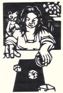 Voor het tijdschrift KLADBLOK februari 2021 met het thema 'Dobbelsteen' een ingespannen dobbelspeelster die het liefst three of a kind werpt en aangespoord wordt door haar even fanatieke kat.