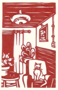 2020Voor het tijdschrift KLADBLOK dat in haar december2020-aflevering in het teken stond van 'schrootjes' knipte ik een klassiek interieur met plankjes op de wand en plafond en natuurlijk een poes.